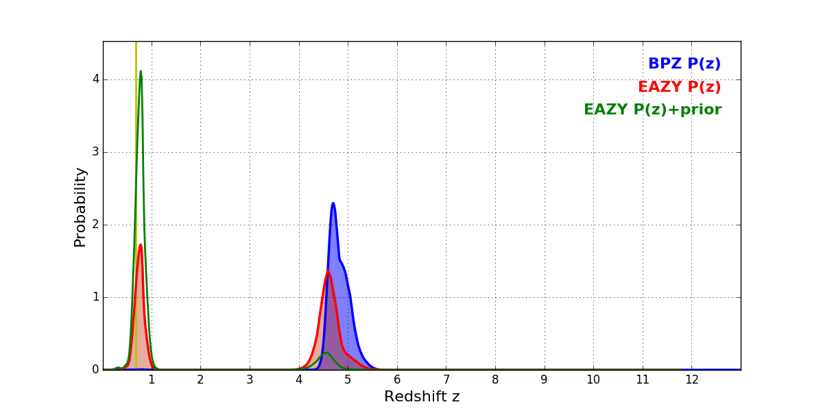 In P(z) plots: Yellow lines mark the cluster redshift z = 0.677,