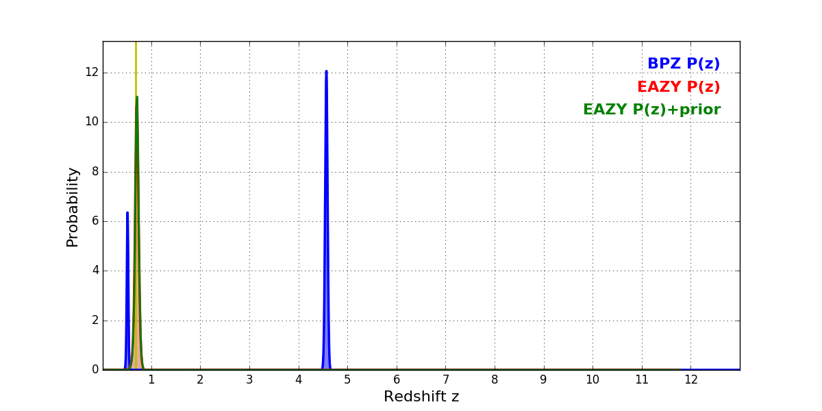 In P(z) plots: Yellow lines mark the cluster redshift z = 0.677,