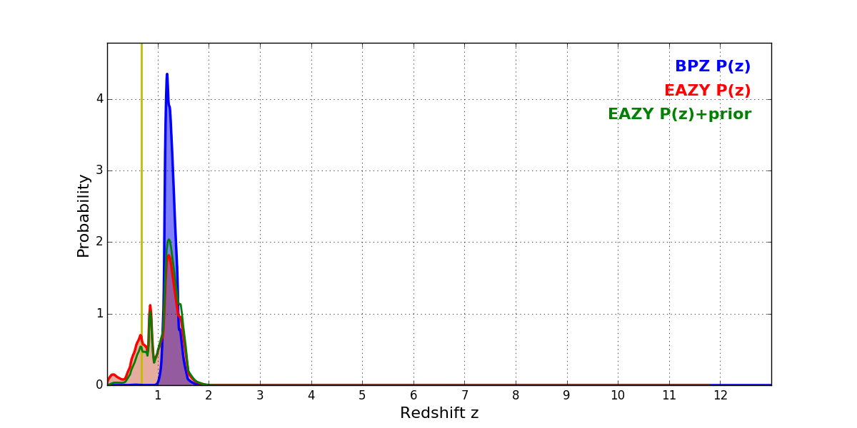 In P(z) plots: Yellow lines mark the cluster redshift z = 0.677,