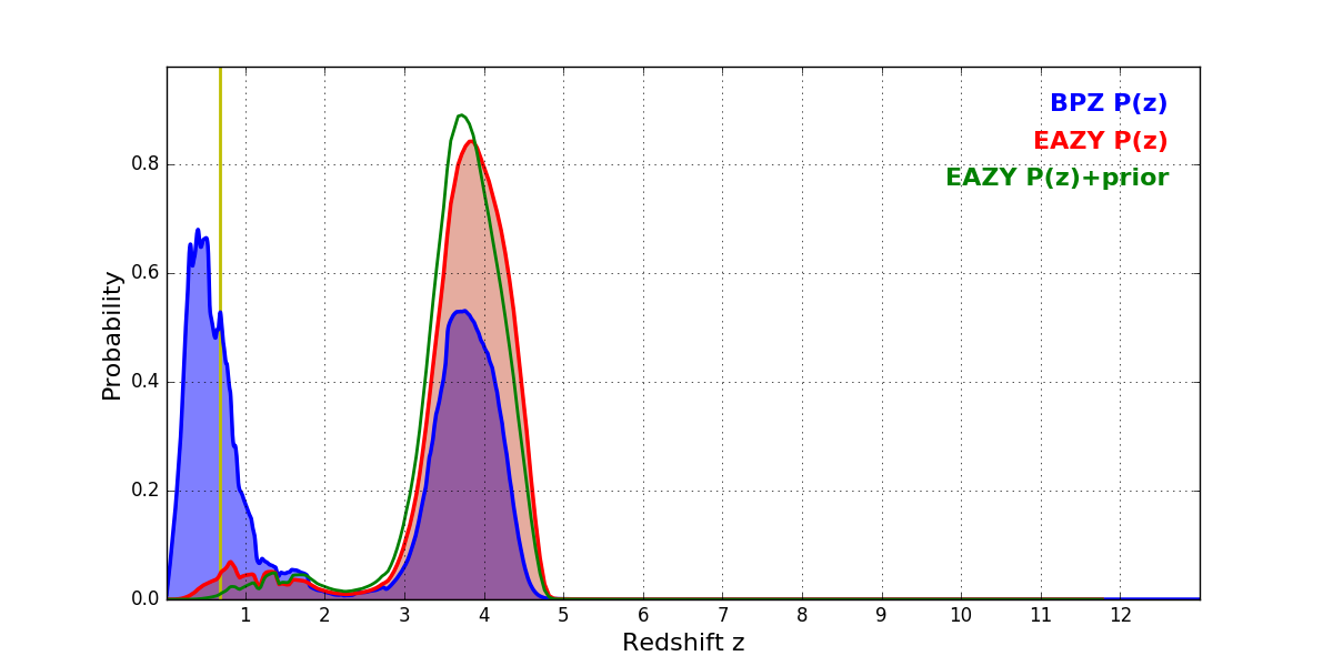 In P(z) plots: Yellow lines mark the cluster redshift z = 0.677,