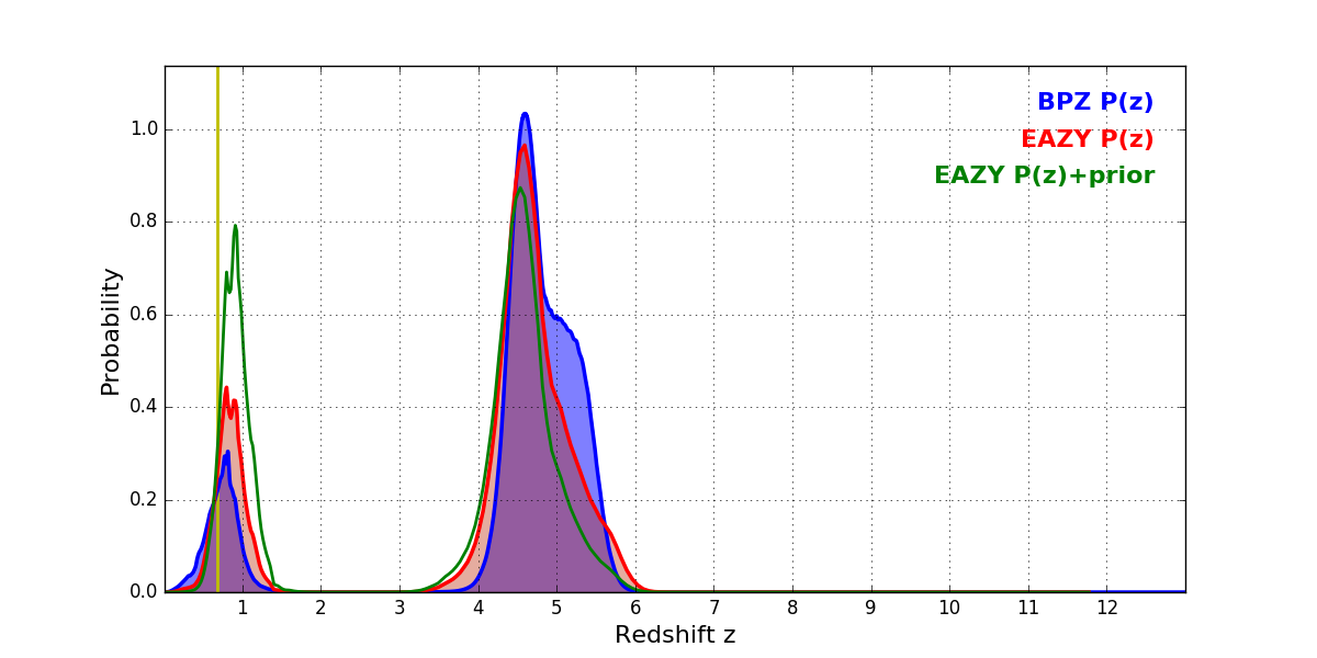 In P(z) plots: Yellow lines mark the cluster redshift z = 0.677,