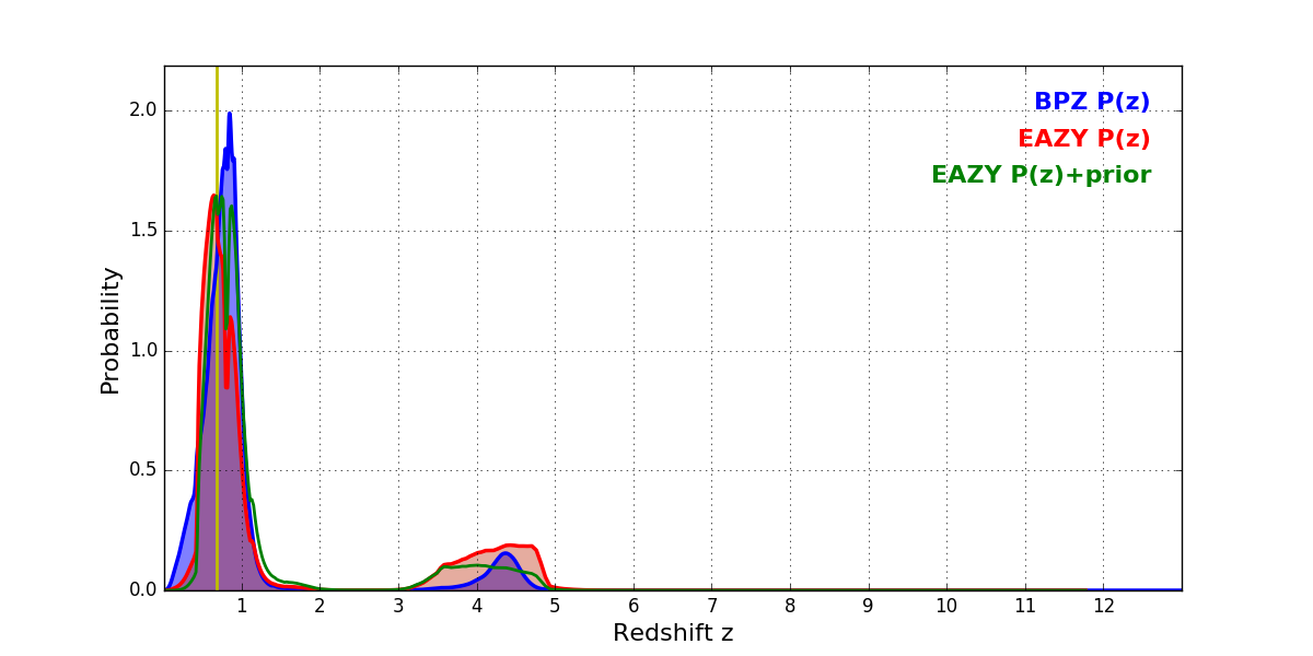 In P(z) plots: Yellow lines mark the cluster redshift z = 0.677,