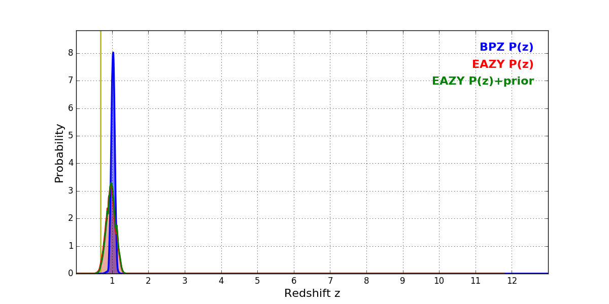 In P(z) plots: Yellow lines mark the cluster redshift z = 0.677,
