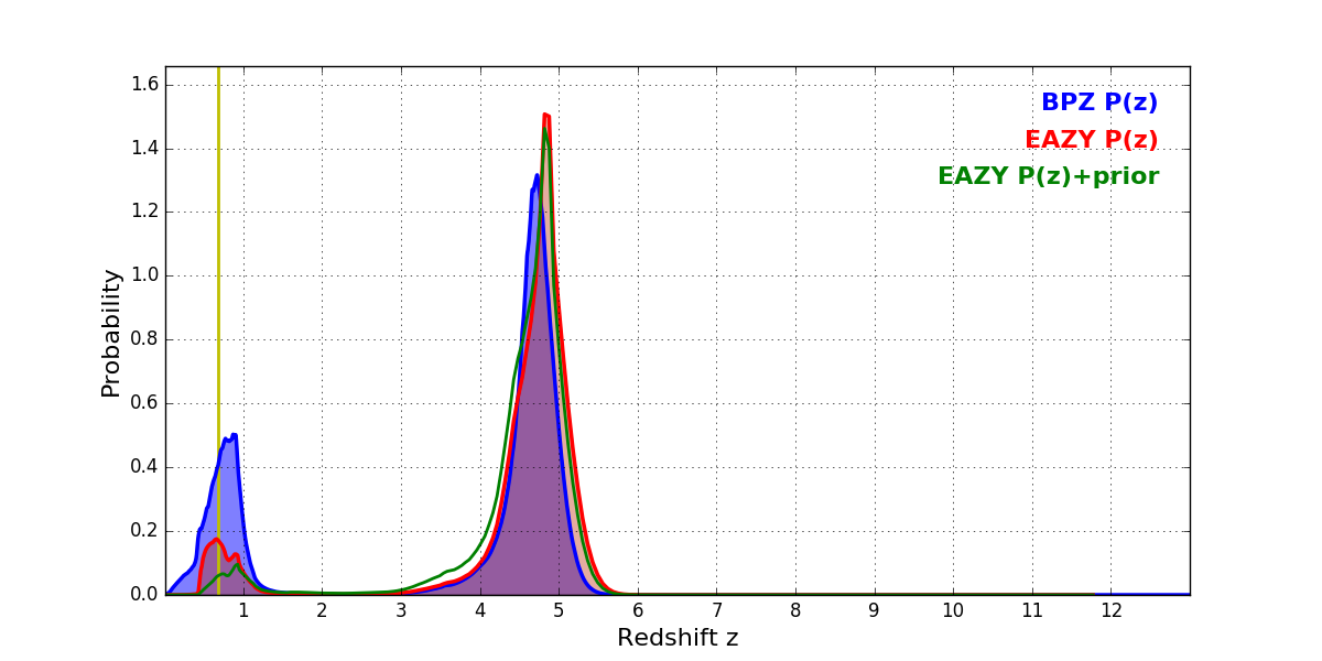 In P(z) plots: Yellow lines mark the cluster redshift z = 0.677,