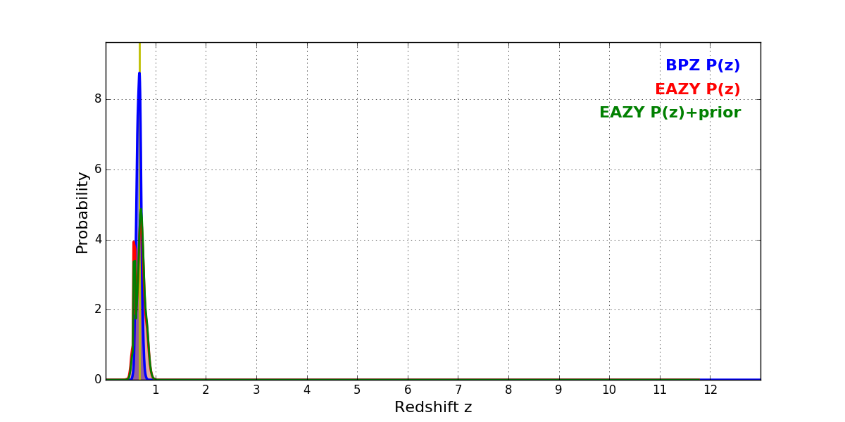 In P(z) plots: Yellow lines mark the cluster redshift z = 0.677,