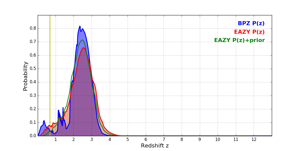 In P(z) plots: Yellow lines mark the cluster redshift z = 0.677,