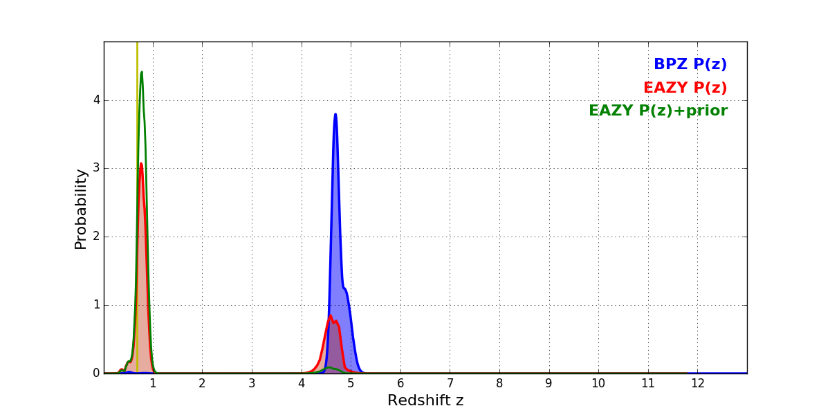 In P(z) plots: Yellow lines mark the cluster redshift z = 0.677,