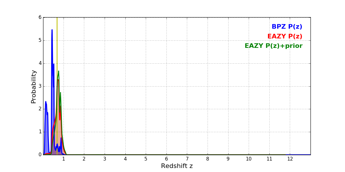 In P(z) plots: Yellow lines mark the cluster redshift z = 0.677,