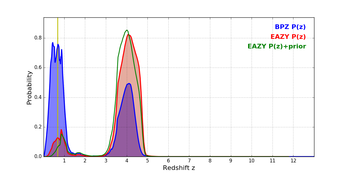 In P(z) plots: Yellow lines mark the cluster redshift z = 0.677,