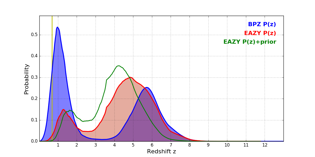 In P(z) plots: Yellow lines mark the cluster redshift z = 0.677,