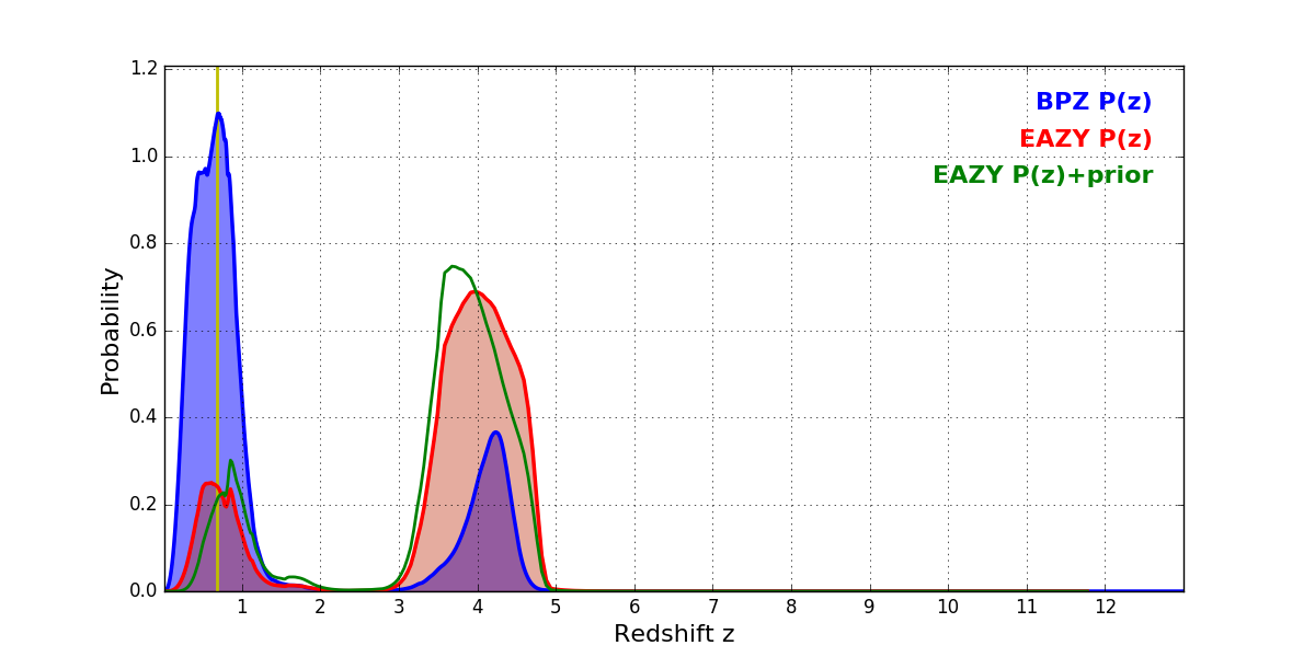 In P(z) plots: Yellow lines mark the cluster redshift z = 0.677,