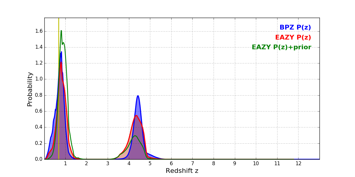 In P(z) plots: Yellow lines mark the cluster redshift z = 0.677,