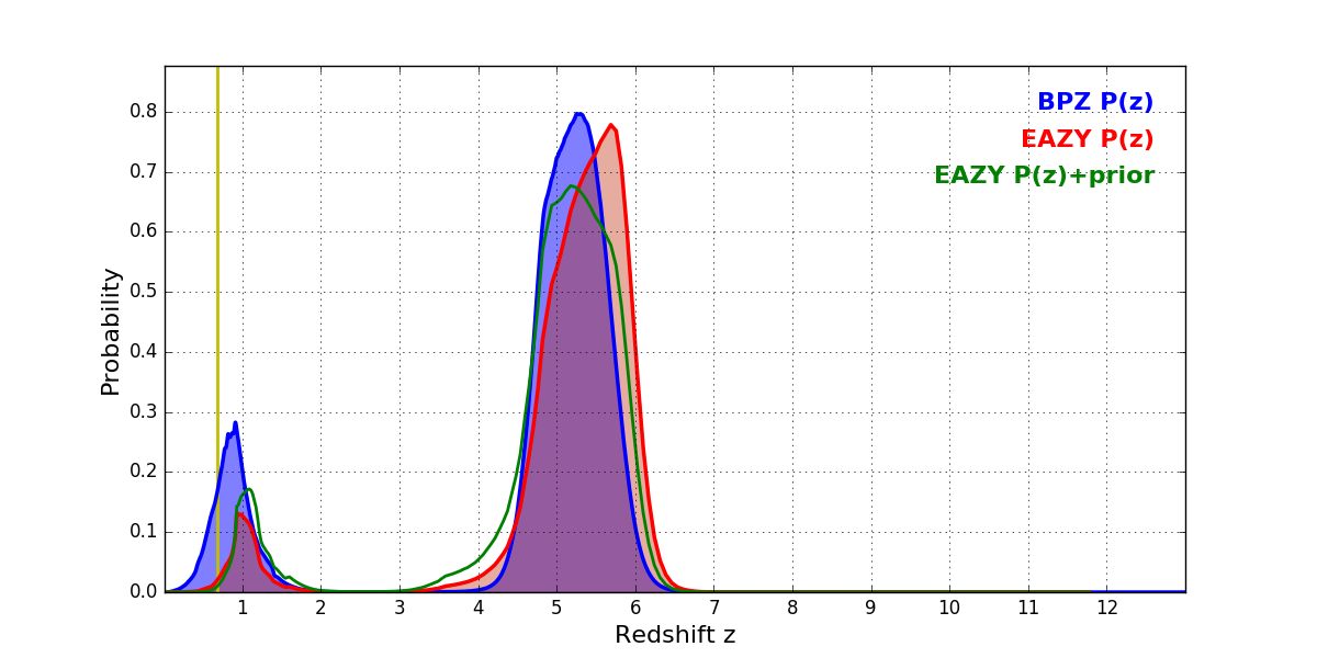 In P(z) plots: Yellow lines mark the cluster redshift z = 0.677,