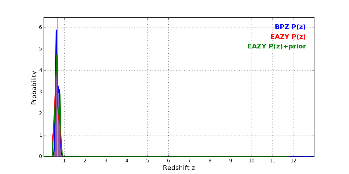 In P(z) plots: Yellow lines mark the cluster redshift z = 0.677,