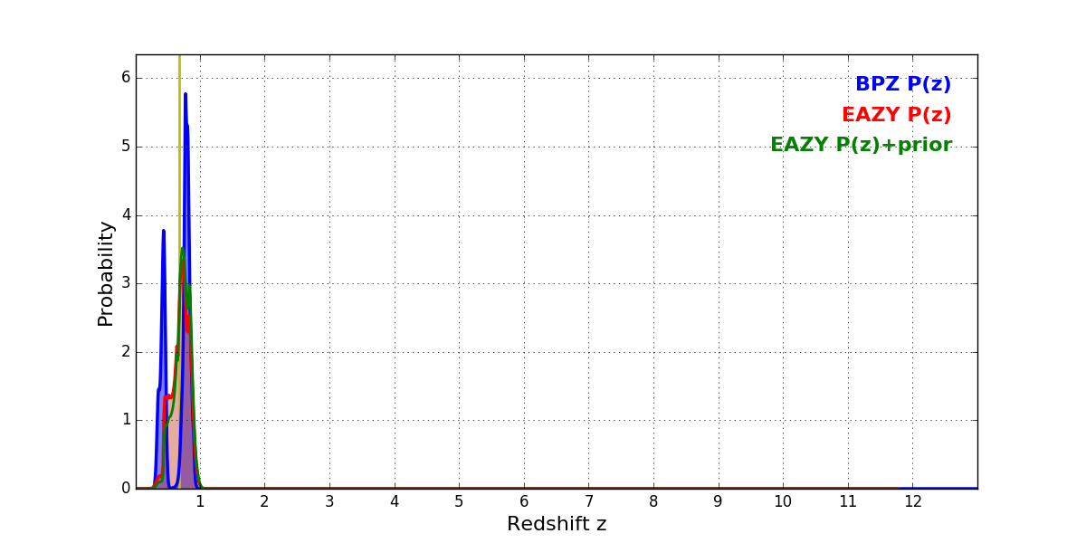 In P(z) plots: Yellow lines mark the cluster redshift z = 0.677,