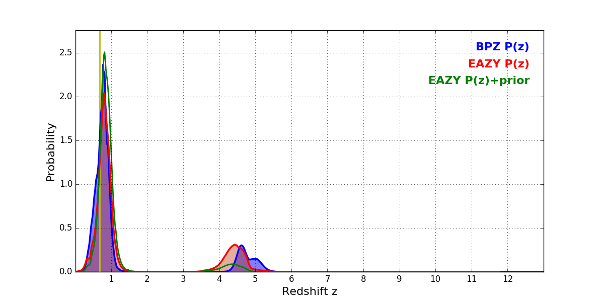In P(z) plots: Yellow lines mark the cluster redshift z = 0.677,