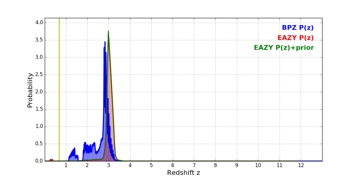 In P(z) plots: Yellow lines mark the cluster redshift z = 0.677,
