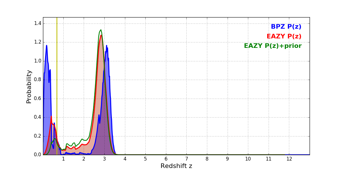 In P(z) plots: Yellow lines mark the cluster redshift z = 0.677,