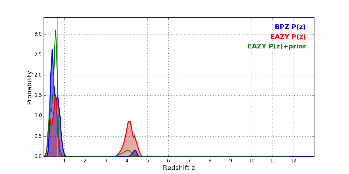 In P(z) plots: Yellow lines mark the cluster redshift z = 0.677,