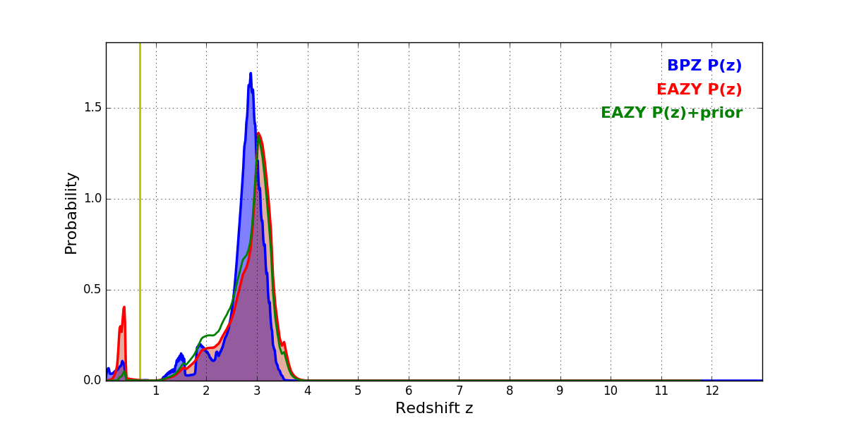 In P(z) plots: Yellow lines mark the cluster redshift z = 0.677,