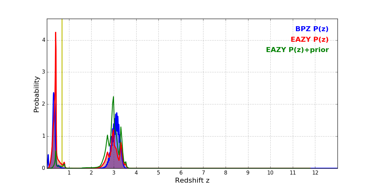 In P(z) plots: Yellow lines mark the cluster redshift z = 0.677,