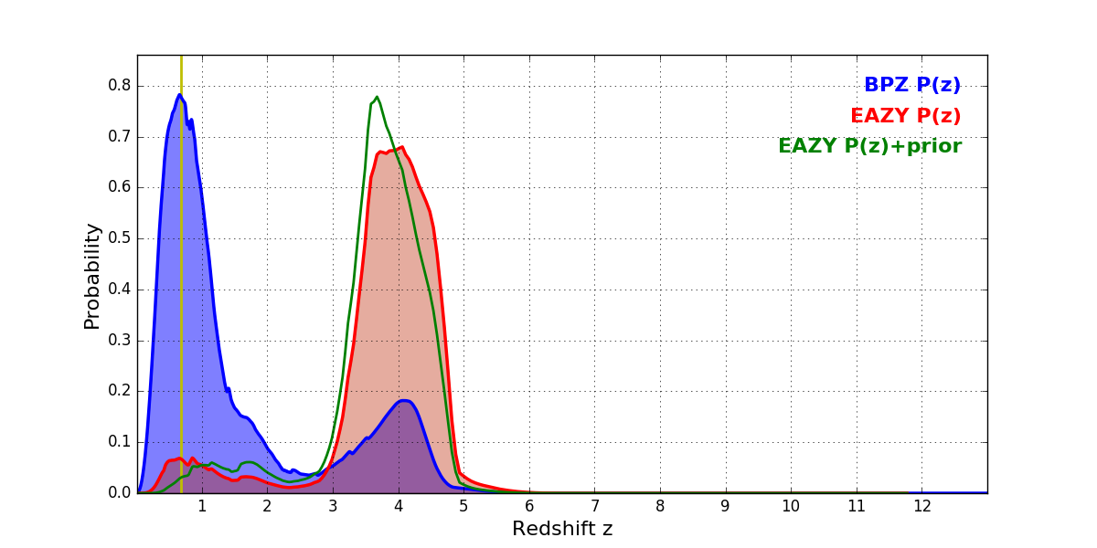 In P(z) plots: Yellow lines mark the cluster redshift z = 0.677,