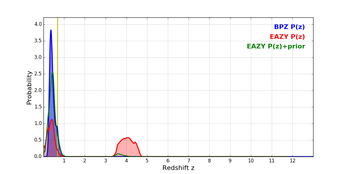In P(z) plots: Yellow lines mark the cluster redshift z = 0.677,