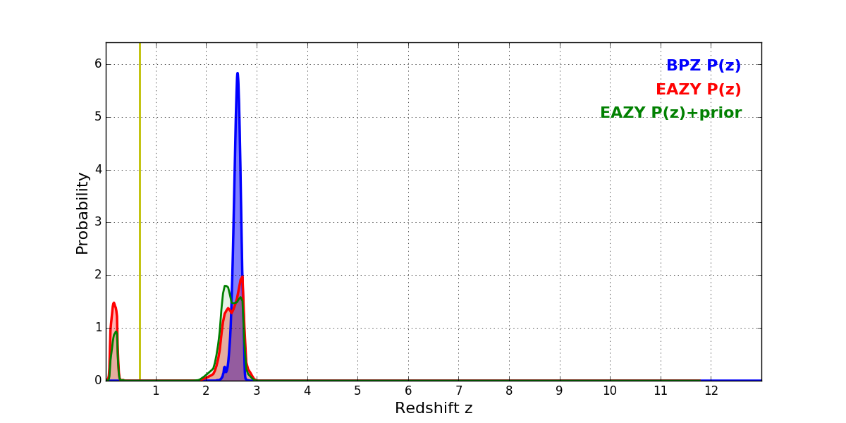 In P(z) plots: Yellow lines mark the cluster redshift z = 0.677,