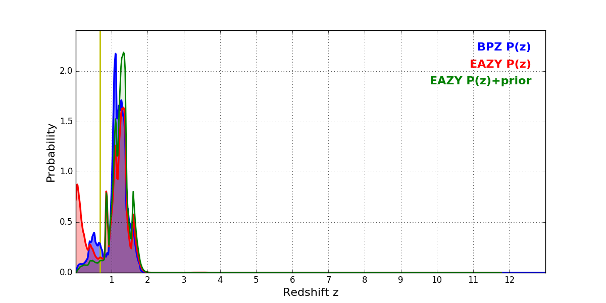 In P(z) plots: Yellow lines mark the cluster redshift z = 0.677,