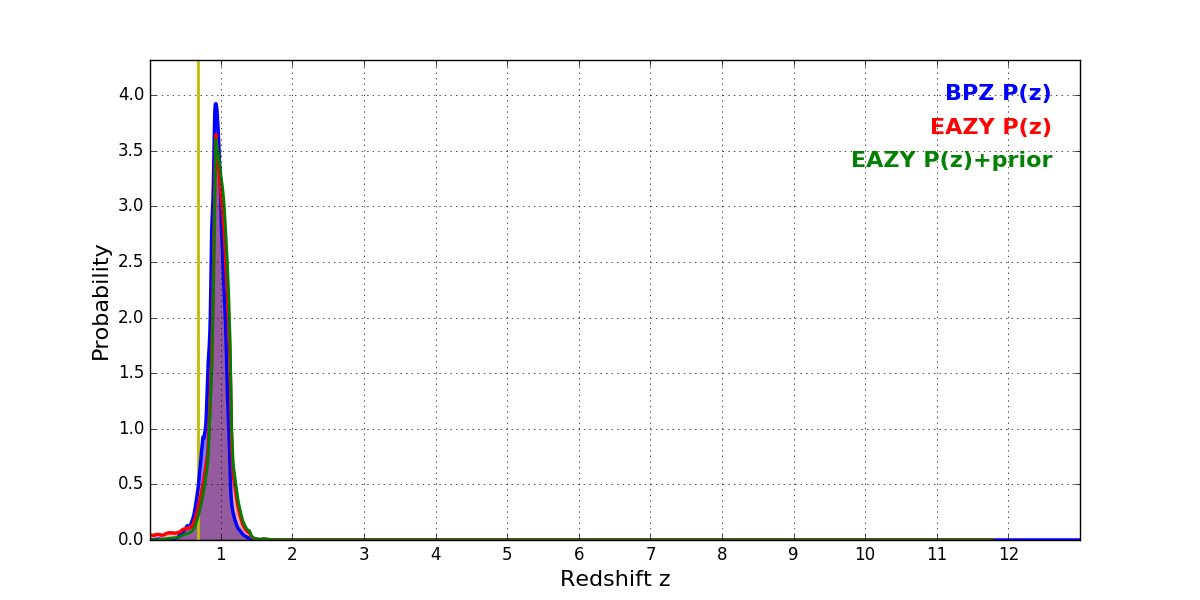 In P(z) plots: Yellow lines mark the cluster redshift z = 0.677,