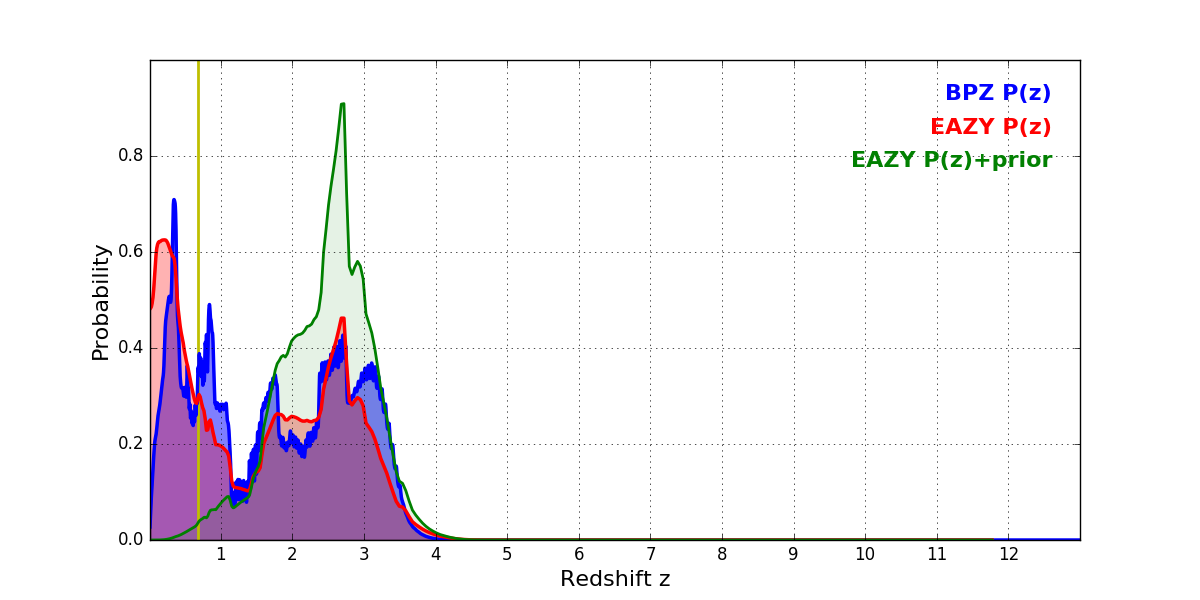 In P(z) plots: Yellow lines mark the cluster redshift z = 0.677,
