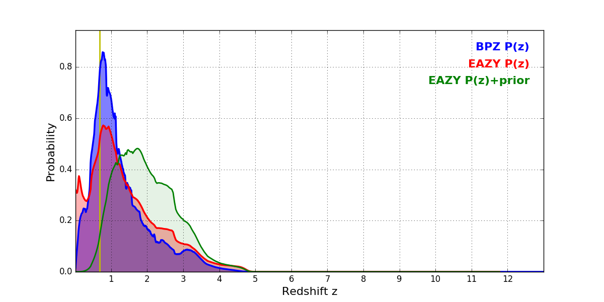 In P(z) plots: Yellow lines mark the cluster redshift z = 0.677,