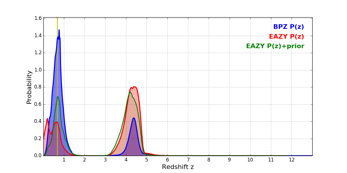 In P(z) plots: Yellow lines mark the cluster redshift z = 0.677,