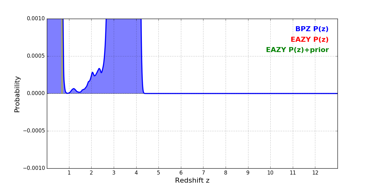 In P(z) plots: Yellow lines mark the cluster redshift z = 0.677,