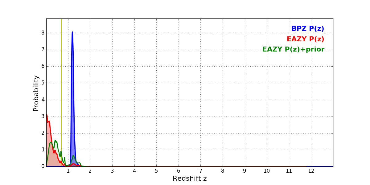 In P(z) plots: Yellow lines mark the cluster redshift z = 0.677,