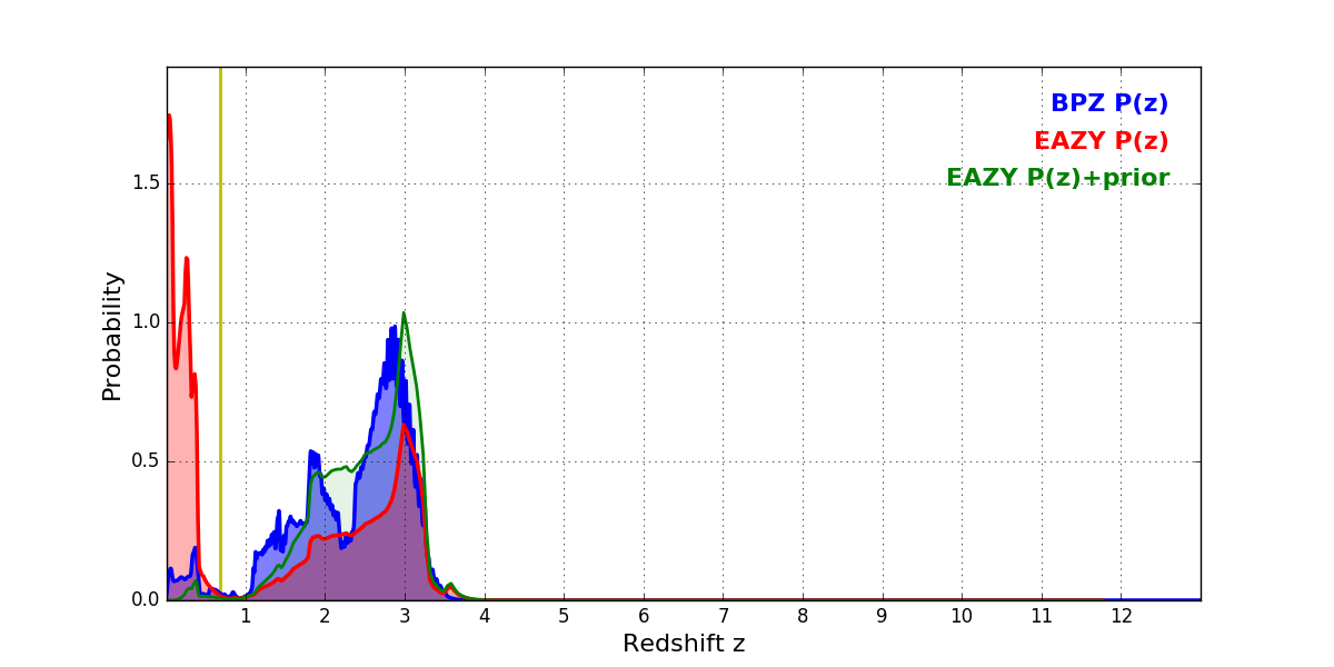 In P(z) plots: Yellow lines mark the cluster redshift z = 0.677,