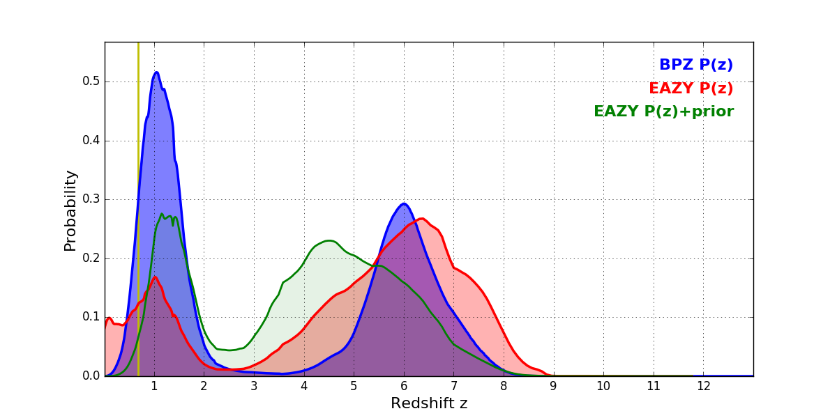 In P(z) plots: Yellow lines mark the cluster redshift z = 0.677,
