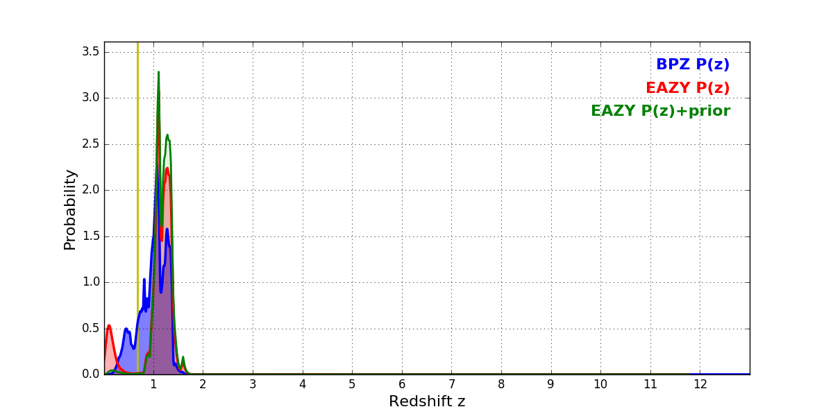 In P(z) plots: Yellow lines mark the cluster redshift z = 0.677,