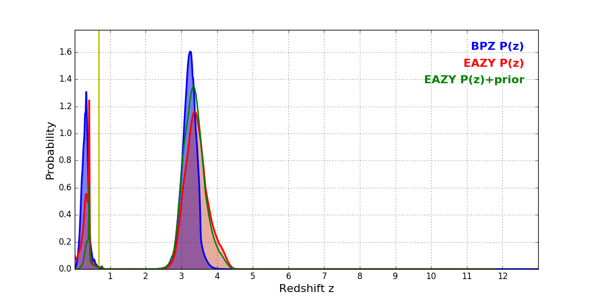 In P(z) plots: Yellow lines mark the cluster redshift z = 0.677,