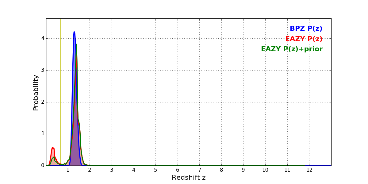 In P(z) plots: Yellow lines mark the cluster redshift z = 0.677,
