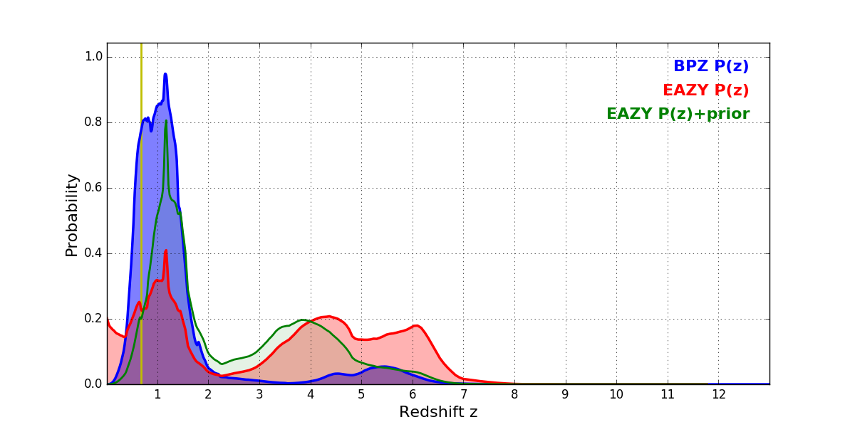 In P(z) plots: Yellow lines mark the cluster redshift z = 0.677,