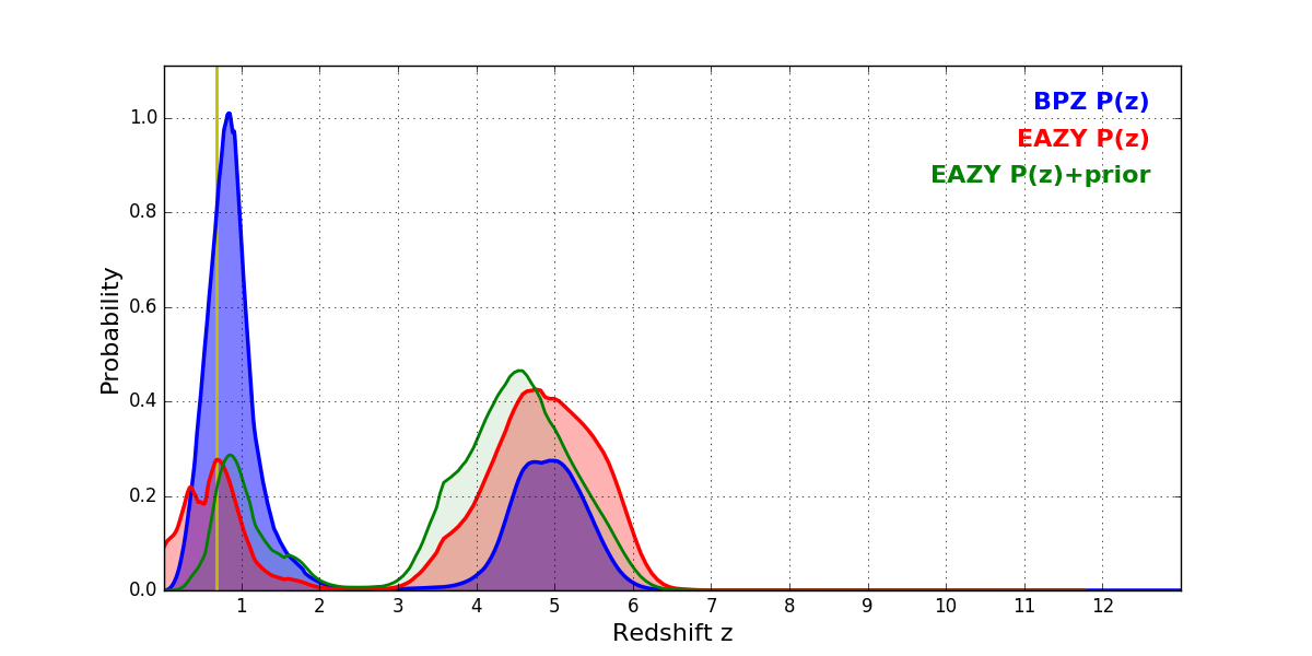 In P(z) plots: Yellow lines mark the cluster redshift z = 0.677,