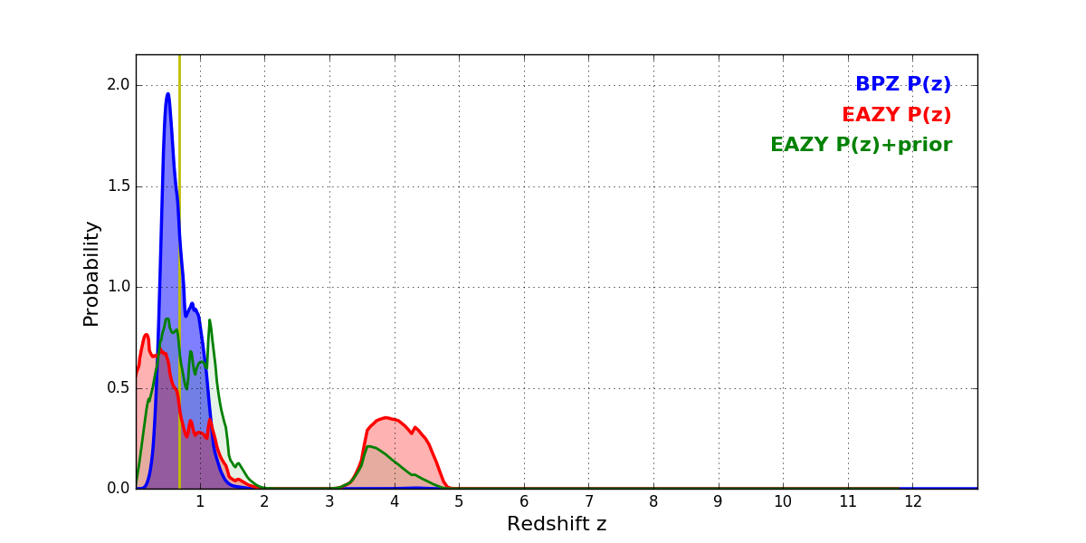 In P(z) plots: Yellow lines mark the cluster redshift z = 0.677,