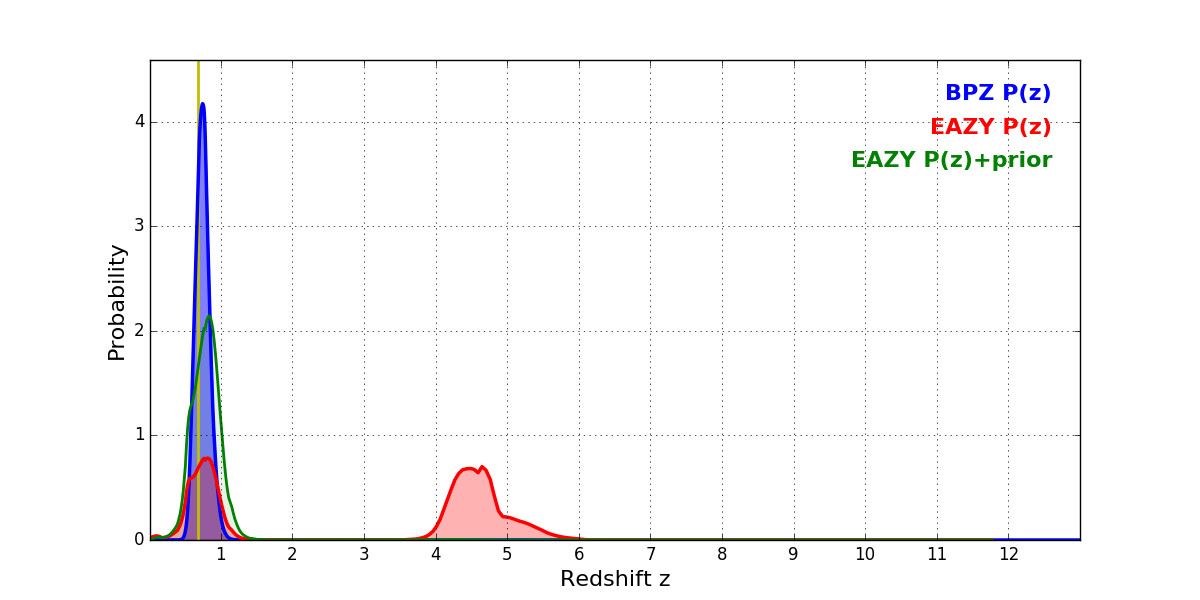 In P(z) plots: Yellow lines mark the cluster redshift z = 0.677,