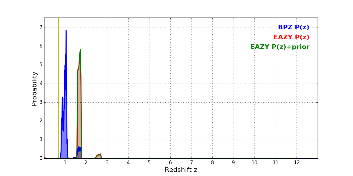 In P(z) plots: Yellow lines mark the cluster redshift z = 0.677,