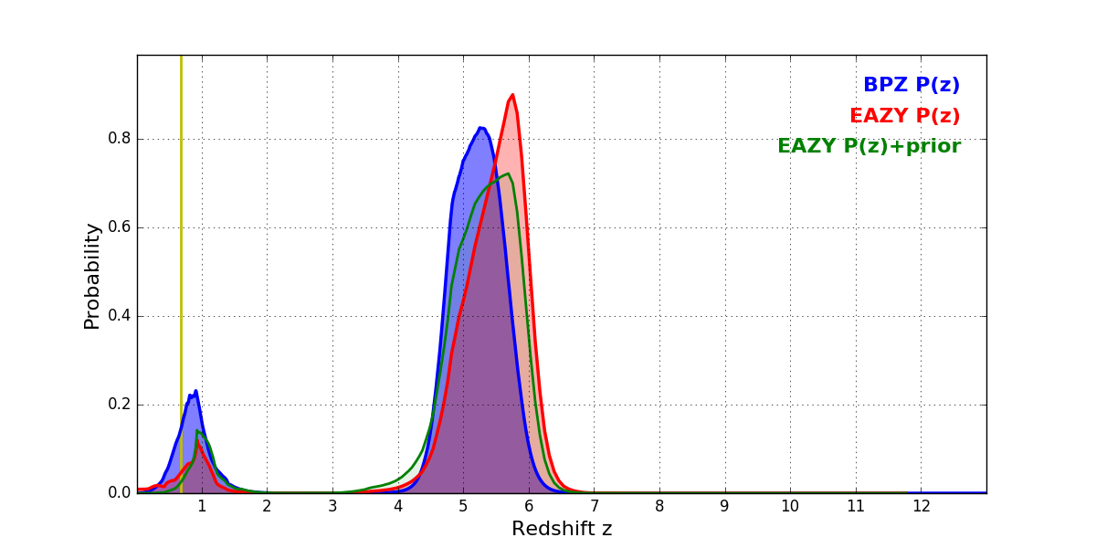 In P(z) plots: Yellow lines mark the cluster redshift z = 0.677,