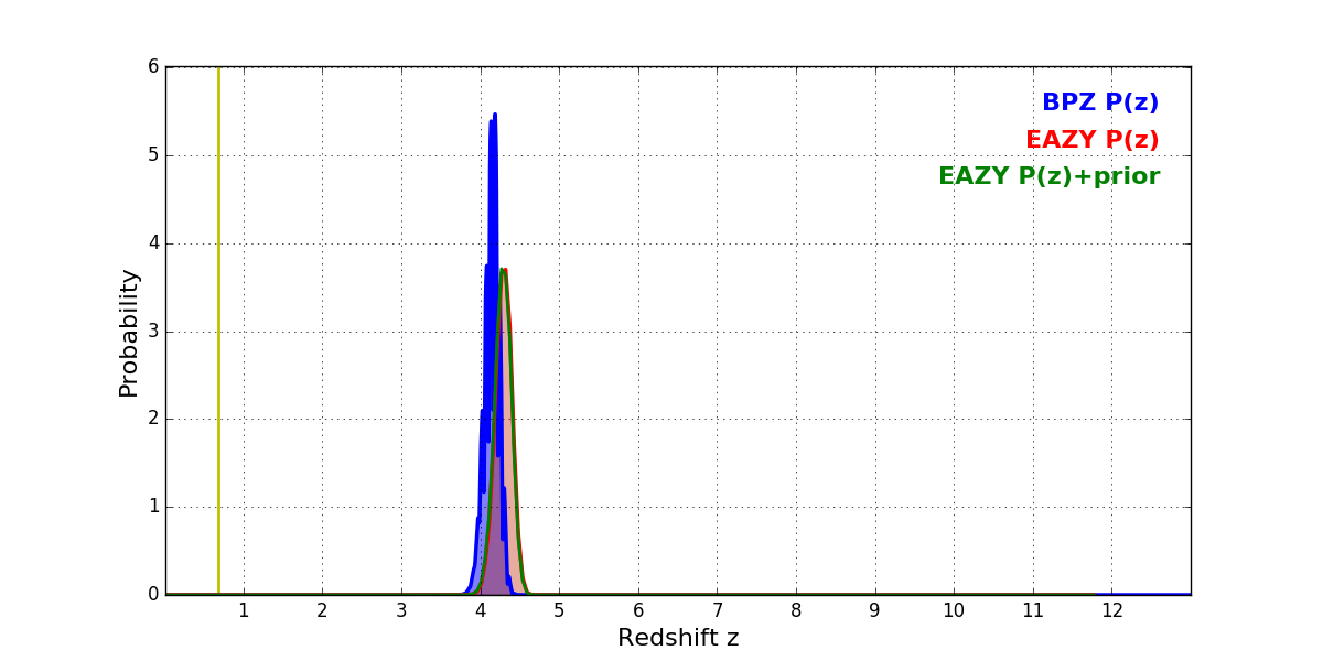 In P(z) plots: Yellow lines mark the cluster redshift z = 0.677,