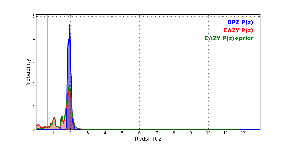 In P(z) plots: Yellow lines mark the cluster redshift z = 0.677,