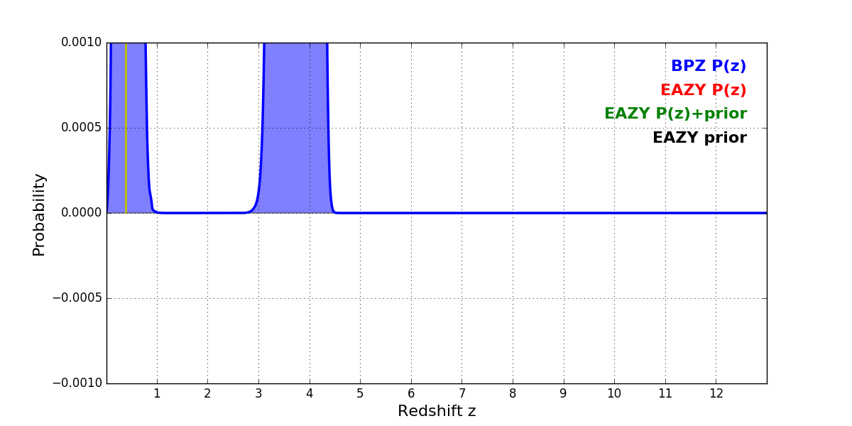 In P(z) plots: Yellow lines mark the cluster redshift z = 0.390,