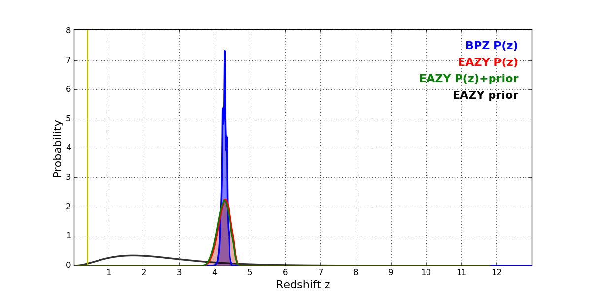 In P(z) plots: Yellow lines mark the cluster redshift z = 0.390,